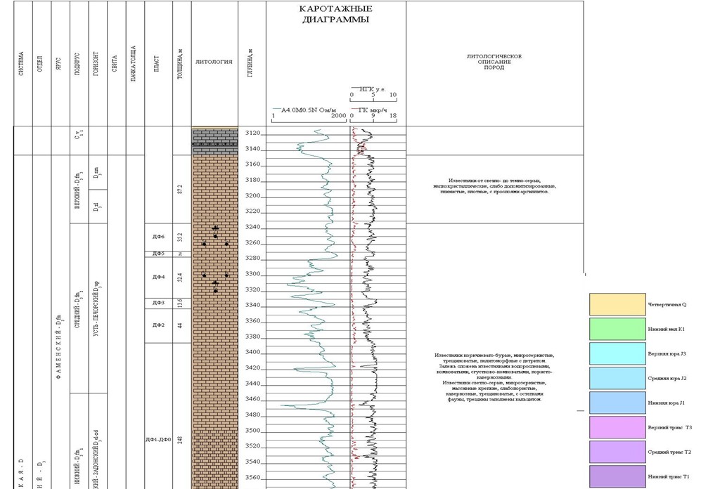 Пласт ДФ4. Пласт характеризуется значительной литолого-фациальной неоднородностью, выражающейся как в значительной расчлененности, так и в замещении отдельных проницаемых прослоев непроницаемыми разностями. Повсеместное развитие макро и микротрещиноватости предопределило гидродинамическую связь пластов-коллекторов ДФ4 и нижележащих ДФ3, ДФ2.