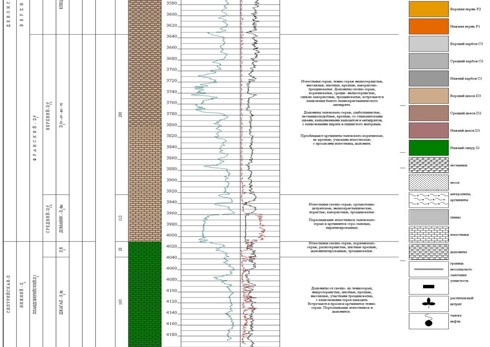 Доманиковый (D3dm) горизонт сложен в основном карбонатными породами – органогенно-детритовыми известняками, пористыми, кавернозными, участками трещиноватыми с многочисленной фауной и доломитами темно-коричневыми до бурых, скрытокристаллическими, кавернозными с включениями ангидрита. Данный разрез характеризует шельфовый фациальный тип.