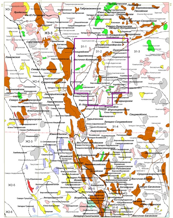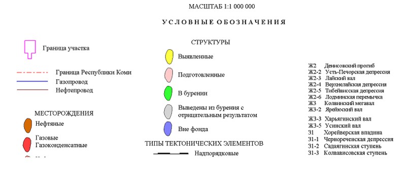 Согласно региональному тектоническому районированию осадочного чехла территория Ошкотынского месторождения приурочена к структуре первого порядка – Колвависовской ступени Хорейверской впадины, зоне сочленения Садаягинской ступени с Чернореченской депрессией. В структурном плане впадина представляет собой область погружения горизонтов верхней части осадочного чехла между Колвинским мегавалом на западе, валом Сорокина на востоке и грядой Чернышова на юге и юго-востоке. Северная часть впадины продолжается под акваторию Печорского моря (рис. 2.).
