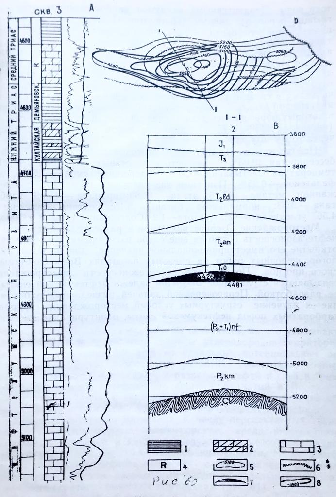 Рис.1. Месторождение Озерное. А- геолого-геофизический разрез нижней части триасовых отложений; Б- структурная карта по отражающему сейсмическому горизонту «Т»; В – профильный геологический разрез. 1- аргиллиты; 2- известняки глинистые; 3- известняки; 4- ореперная пачка в подощве анизийского яруса; 5- изогипсы отражающего горизонта «Т»; 6- зона тектонического нарушения; 7- нефтяная залежь; 8- изогипсы второго варианта структурной карты.