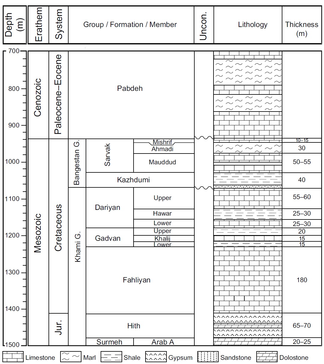 The Kazhdumi Formation has not been dated biostratigraphically in the South Pars field, but elsewhere it, or its equivalents, is considered Albian or Albian–early Cenomanian in age based on foraminifera and palynology (El Beialy and Al-Hitmi,1994; Ibrahim and Al-Hitmi, 2000; Al-Ameri et al., 2001).