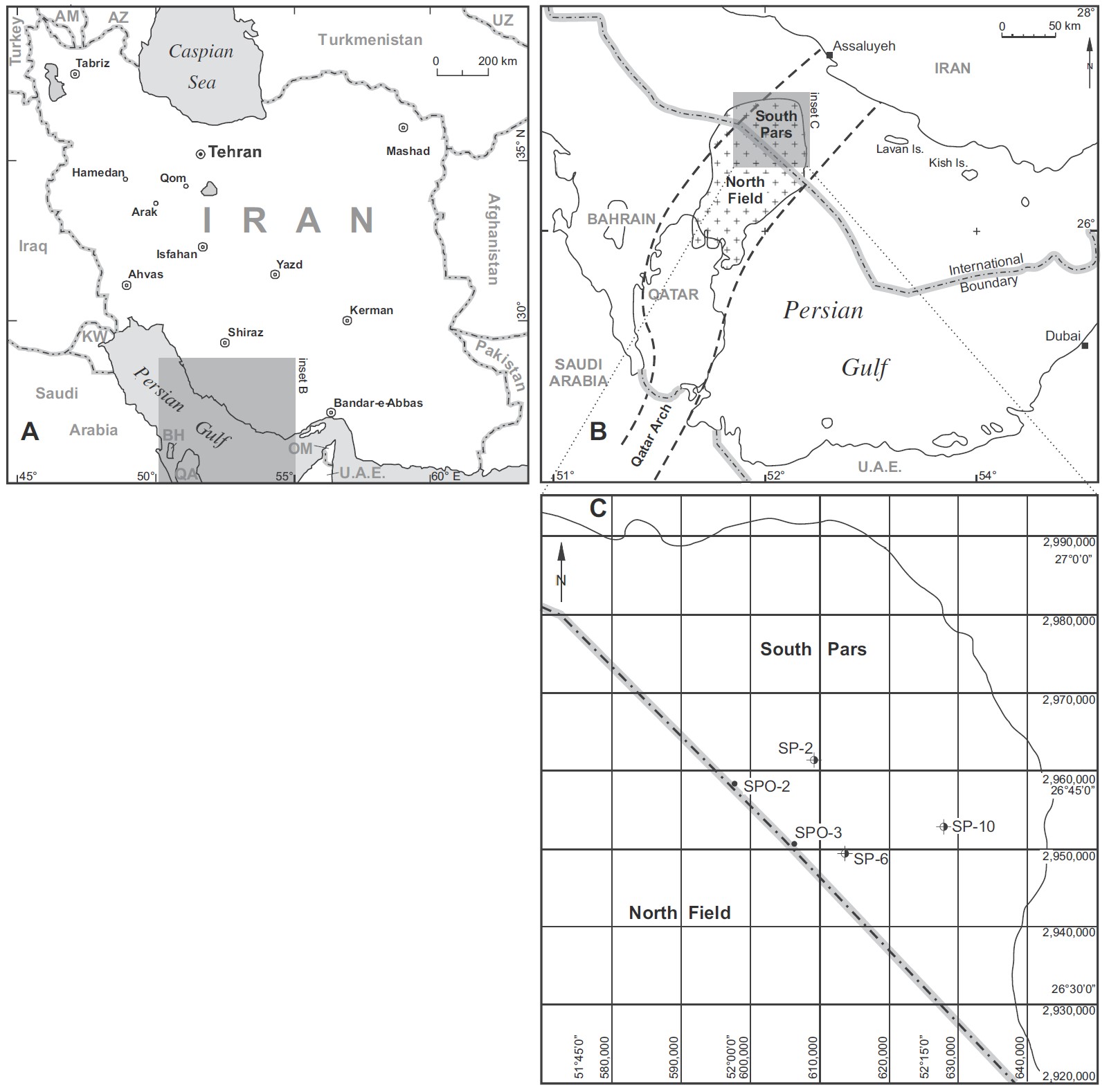 The South Pars field is located in the Persian Gulf at the border between Iran and Qatar, and is 100 km from the port of Asaluyeh on the southern coast of Iran, 105 km northeast of Qatar, and 330 km northwest of Dubai (Fig. 1). The Qatari part of the field (North Field) was discovered in 1971 (Konert et al., 2001) whereas the Iranian sector was detected only in 1990 with the drilling of well SP-1. This giant field has an estimated 3700 km2 extent and is located between 51050/ and 52040/ E, and between 26025/ and 2705/ N. The wells studied are SPO-2, SPO-3, SP-2, SP-6 and SP-10, and their positions are shown on Fig. 1B and C.