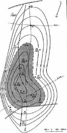 Рис. 1. Пашшорское нефтяное месторождение. Нефтяная залежь в рифогенных отложениях D3fr3 Структурная карта кровли рифогенных отложений сирачойского горизонта верхнего девона (Некрасов и др., 1981 г.)