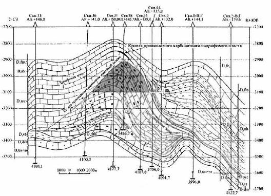Рис. 2. Пашшорское нефтяное месторождение. Геологический разрез продуктивных нижне-среднефранских отложений по линии скважин 33-36-31-38-35- 44-3-1-2 (Некрасов и др., 1981 г.).