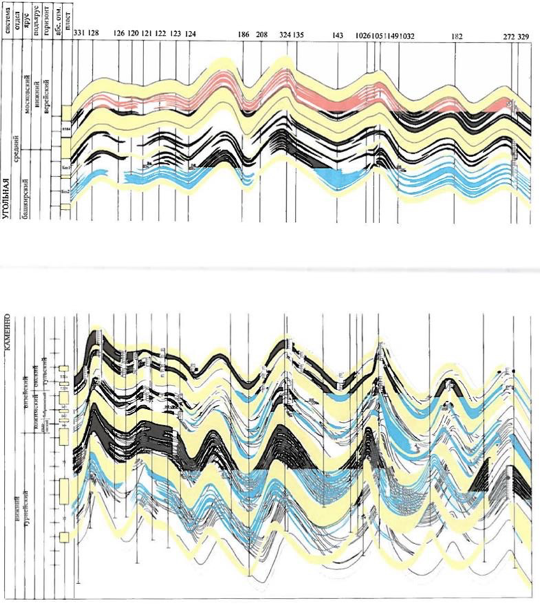 Рис. 1. Схематический разрез среднекаменноугольных отложений по линии скважин 331- 128- 126-120- 121- 122- 123- 124-186-208- 324-135- 143- 1026-1051- 149- 1032- 182- 272- 329 Павловского месторождения