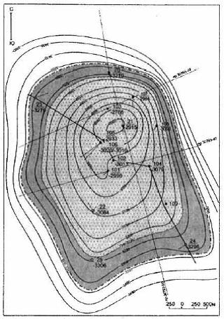 Рис. 1. Печорокожвинское нефтегазоконденсатное месторождение. Газокон- денсатнонефтяная залежь в отложениях D2ef+D3ps. Структурная карта кровли проницаемых песчаников поддоманиковых отложений (Гринько и др., 1996 г.)