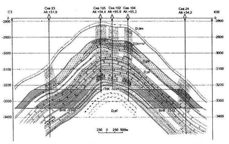 Рис. 2. Печорокожвинское нефтегазоконденсатное месторождение. Геологический разрез продуктивных поддоманиковых отложений по линии скважин 23-105-102-104-24 (Гринько и др., 1996 г.).