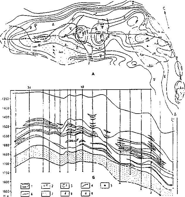 отражающего горизонта А (чаркобожская свита) (А) и разрез (Б): 1 — изогипсы горизонта