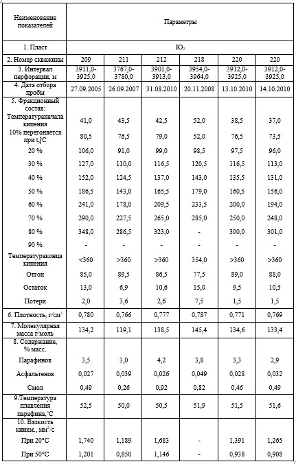 Свойства конденсата определялись по пробам стабильного (дегазированного) конденсата, отобранным при промысловых газоконденсатных исследованиях (Табл. 1).Всего из пласта Ю2отобрано семь проб стабильного конденсата из скважин 209, 211, 212, 218, 220 и 612.