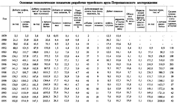 Первоначально разбуривались залежи кизеловского горизонта по равномерной треугольной сетке 400х400 м. В процессе разбуривания были вскрыты и залежи заволжского и фаменского объектов с той же плотностью. Фаменские залежи предусмотрены как возвратные с турнейского яруса. Разработка ведется с заводнением, в основном, внутриконтурным. Технологические показатели залежи турнейского яруса приведены в табл. 2