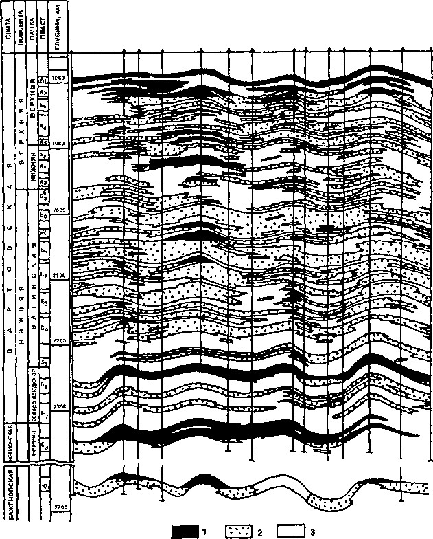 Рис. 1. Покачевское нефтяное месторождение. Литолого-стратиграфический разрез по линии скважин: 1 — нефть; 2 — водонасыщенные песчаники; 3 — глинистые породы