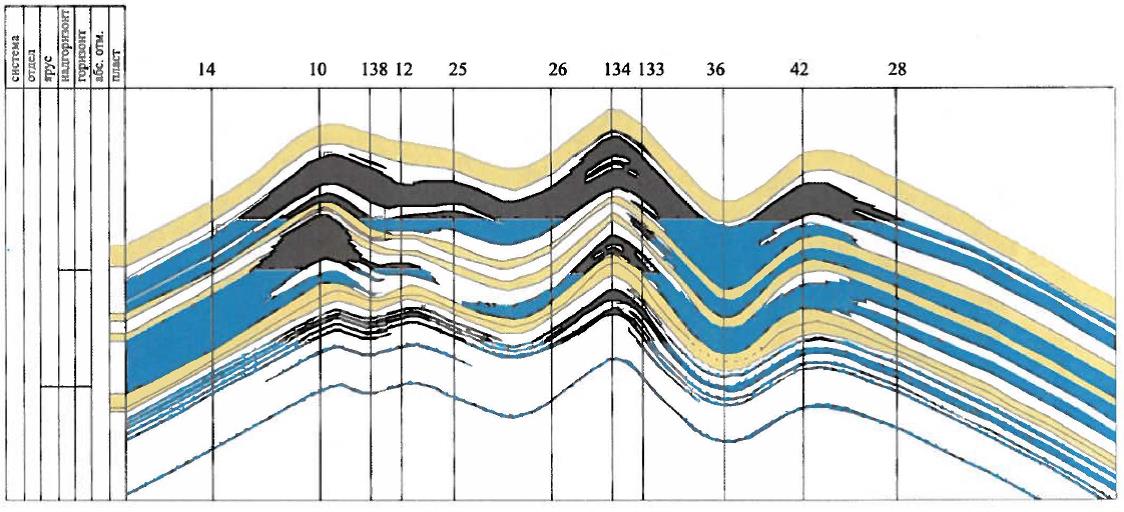 Рис.1. Схематический разрез среднекаменноугольных отложений по линии скважин 14-10-138-12-25-26-134-133-36-42-28 Полазненского месторождения