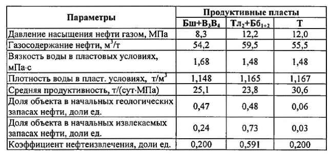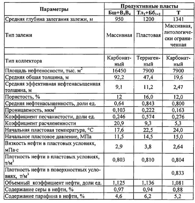 В промышленной эксплуатации находятся три эксплуатационных объекта, приуроченных к отложениям rурнейского (пласт Т), визейского яруса (пласт Бб1-2+Тл2) и башкирско-верейским отложениям (пласт Бш+В3В4). Геолого-физические характеристики продуктивных пластов приведены в табл.1.