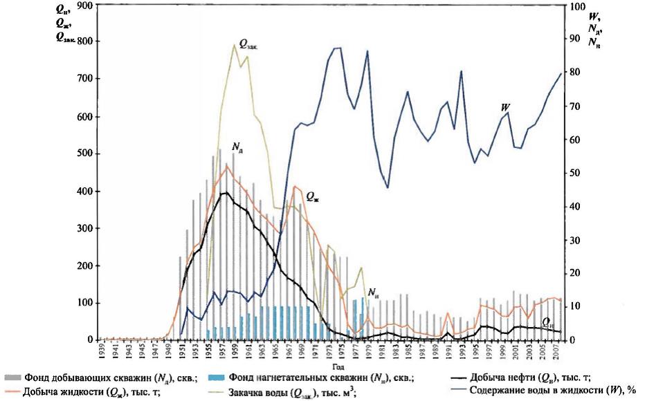 Кроме того, часть добывающих скважин выведена из эксплуатации по организационным и техническим причинам из-за плохого состояния спецоснований. В периоды с 1955 по 1971 г. и с 1977 по 1979 г. разработка проводилась с поддержанием пластового давления.