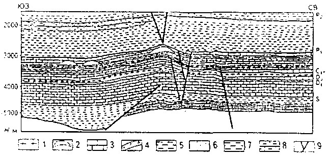 Рнс. 1. Поморское газоконденсатное месторождение (Э.В. Шипилов, P.P. Мурзин, 2001). Сейсмогеологический разрез: 1 — доманик; 2 — рифы; 3 — карбонаты; 4 — кавернозные известняки; 5 — аргиллиты; 6 — песчаники; 7 — глинистые песчаники; 8 — глинистые известняки; 9 — тектонические нарушения