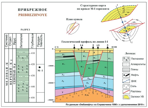 Нефтяное месторождение Прибрежное находится на восточном побережье Каспийского моря. Площадь часто заливается морскими водами, что препятствует детальному исследованию. В структурном отношении месторождение приурочено к двухкрылому соляному куполу северо-восточного простирания. На северо-западном крыле купола и в грабене в высокопроницаемых песчаных пластах разведан верхнемеловой (сеноманский) нефтяной горизонт. В связи с недостаточным изучением строения купола грабеновый участок часто относят к юго-восточному крылу купола.