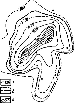 Структурная карта по кровле продуктивного горизонта П: 1 — изогипсы, м; 2 — контур газоносности; 3 — зона отсутствия продуктивного горизонта
