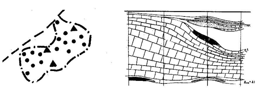Рис.1. Карта контуров залежей в ДI. Геологический профиль