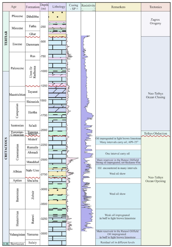 В нижнемеловом разрезе установлено пять продуктивных горизонтов: в известняках свиты Мауддуд (альб) на глубине 2458-2508 м, песчаниках свит Нахр Умр (альб) и Зубейр (готерив-баррем) в интервале 2575-3315 м, известняках свит Ратави (валанжин) и Ямама