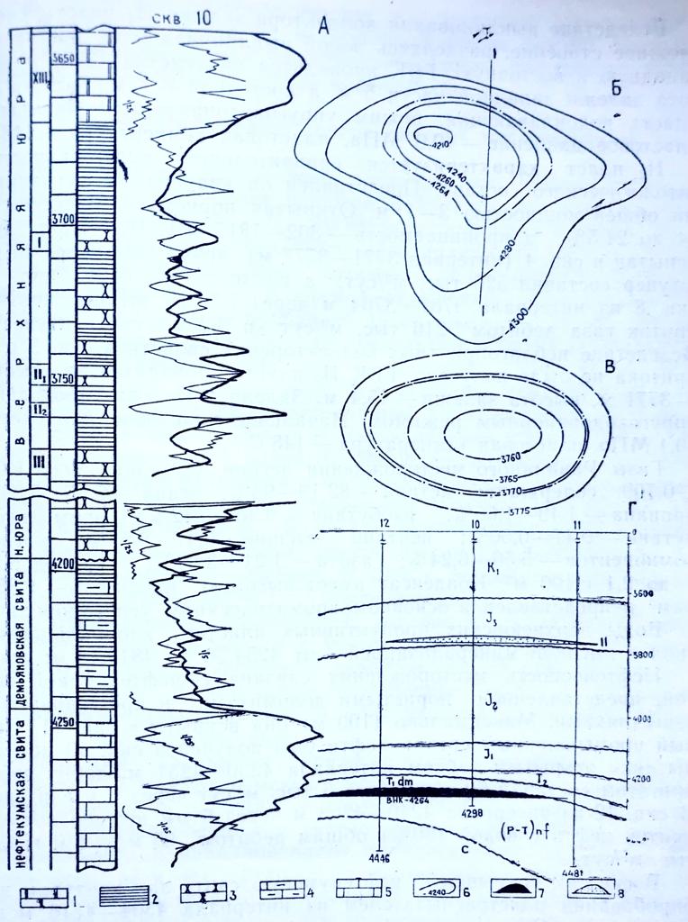 А- геолого-геофизический разрез; Б- структурная карта по триасовому отражающему горизонту «Т»; В- структурная карта по кровле II пласта верхней юры; Г- профильный геологический разрез. 1- доломиты; 2- аргилиты; 3- песчаники; 4- известняки глинистые; 5- известняки; 6- стратоизогипсы отражающего горизонта «Т»; 7- нефтяная залежь; 8- газоконденсатная залежь.