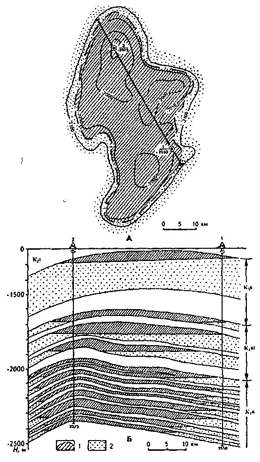 Рис. 1. Русановское газоконденсатное месторождение в плане (А) и разрезе (Б) (Э.В. Шепилов, P.P. Мурзин, 2001): 1 — газ; 2 — песчаники