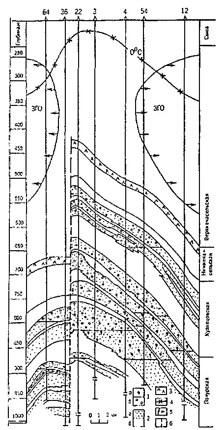 Рис. 1. Русское газонефтяное месторождение. Геологический разрез (составил С.Е. Агалаков, сеноман - по В.Н. Андрюкову):1 — залежи: а — нефтяные, б — газовые; 2 — породы: а — проницаемые, б — непроницаемые; 3 — кремнистые аргиллиты; 4 — подошва распространения многолетнемерзлых пород; 5 — интервал с условиями, благоприятными для зоны гидратообразования (ЗГО); 6 — разлом