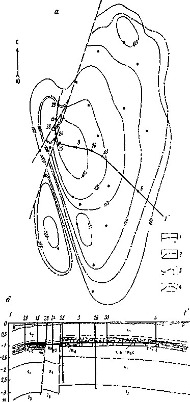 Рис. 2. Русское газонефтяное месторождение. Геологический разрез (по С.Е. Агалакову, В.Н. Андрюкову). а — структурная карта продуктивного горизонта ПК1-2 (сеноман); б — геологический профиль. Контуры нефтегазоносности продуктивного горизонта ПК1-2: 1 — восточный блок, 2 — юго-западный купол, 3 — центральный блок, 4 — западный блок