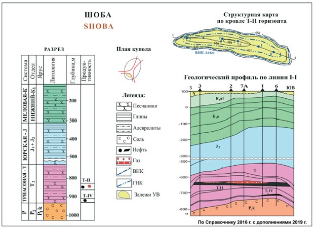 Нефтяное месторождение Шоба расположено на крайнем юго-западе Восточно-Прикаспийской НГО, южнее месторождения Копа. В структурном отношении месторождение контролируется одноименным трехкрылым соляным куполом. На его юго-западном крыле в терригенном разрезе среднего триаса выявлены 2 продуктивных горизонта.
