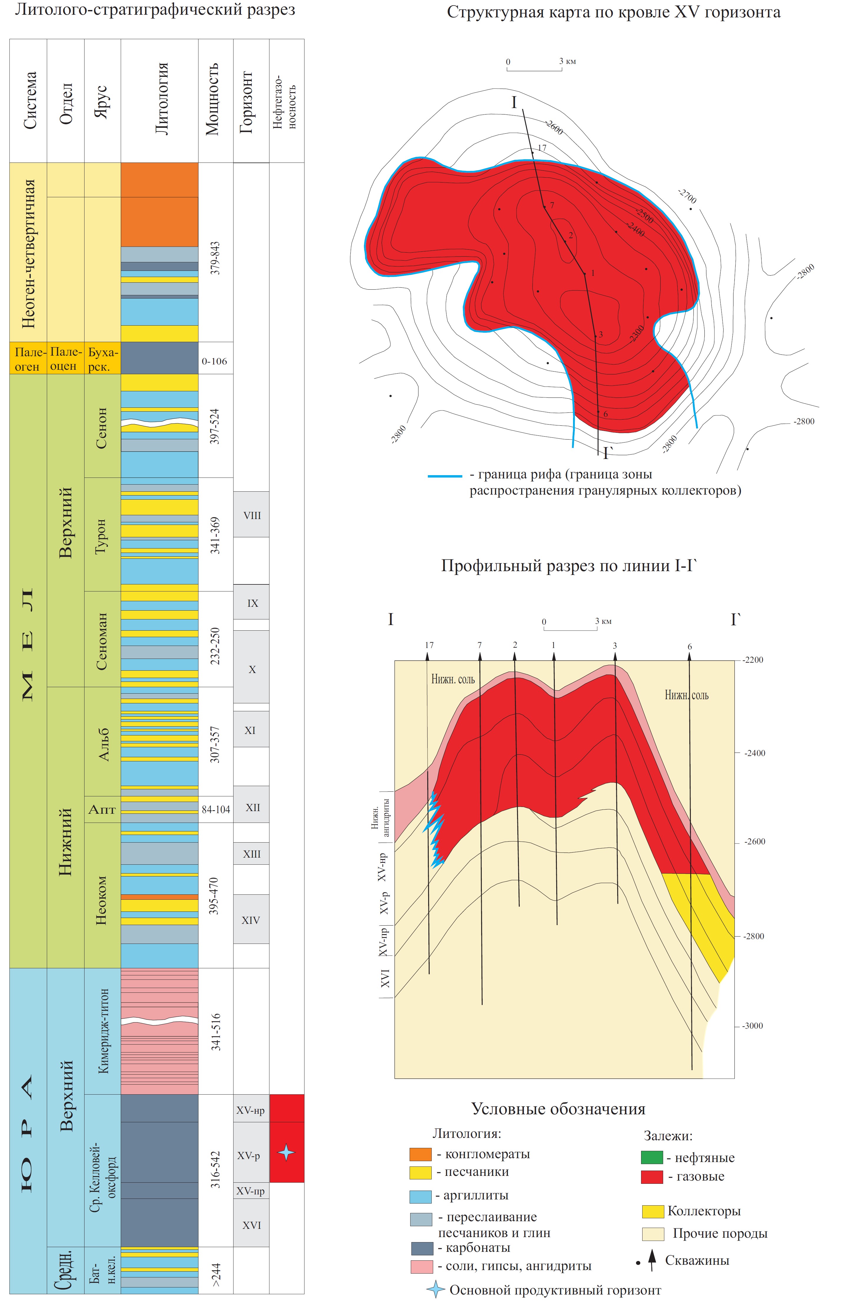 Газоконденсатное месторождение Шуртан расположено в 40 км к юго-западу от г. Карши, в юго-восточной части Бешкентского прогиба. Месторождение открыто в 1974 г. По кровле продуктивных карбонатных верхнеюрских отложений контролируется брахиантиклиналью, наложенной на выступ рифового массива высотой 420 м (рисунок 1). В разрезе юрских карбонатных отложений выделяются три коллекторских горизонта: XVпр, XVр и XVнр. Горизонты представлены пористо-кавернозными комковато-водорослевыми известняками и доломитами. В нижней части горизонта XVпр (60-180 м) гранулярные коллекторы отсутствуют. Глубина залегания продуктивных горизонтов - более 3000 м.