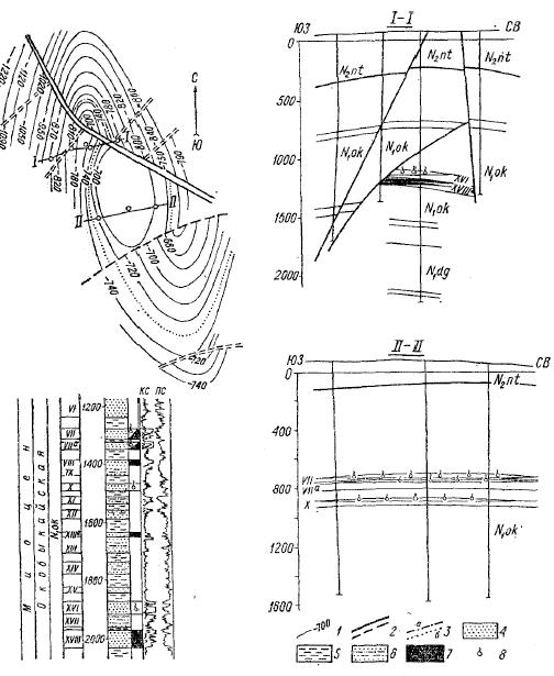 1-изогипсы по кровле VIIпласта, 2- разрывы, 3-контуры: а-нефтеносности, б- газоносности, 4,5,6 - песчаные, глинистые и песчано-глинистые породы соответственно, 7- нефть, 8- газ