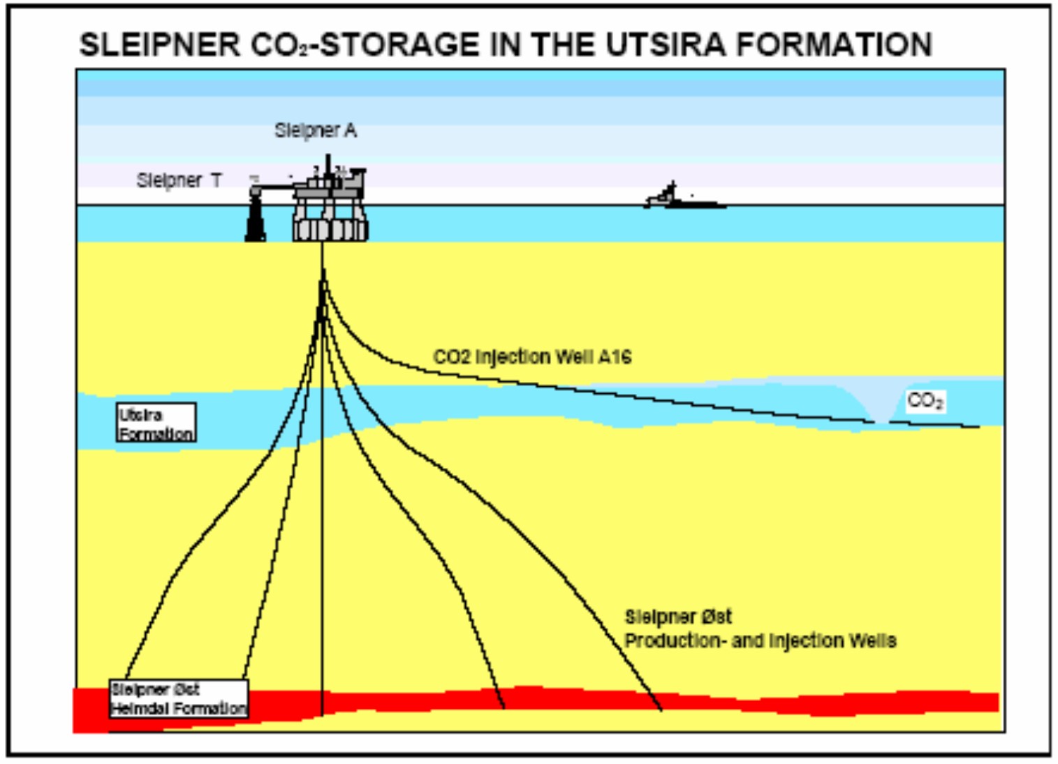 Figure 3. The Sleipner CO2 injection scheme. The Utsira formation is a 200 -250 meters thick and very permeable sandstone overlaid with mudstone. The CO2 capture takes place at the Sleipner T (Treatment) platform where it is also compressed. The highly deviated injection well has been drilled from the nearby Sleipner A concrete platform. (Source Statoil)