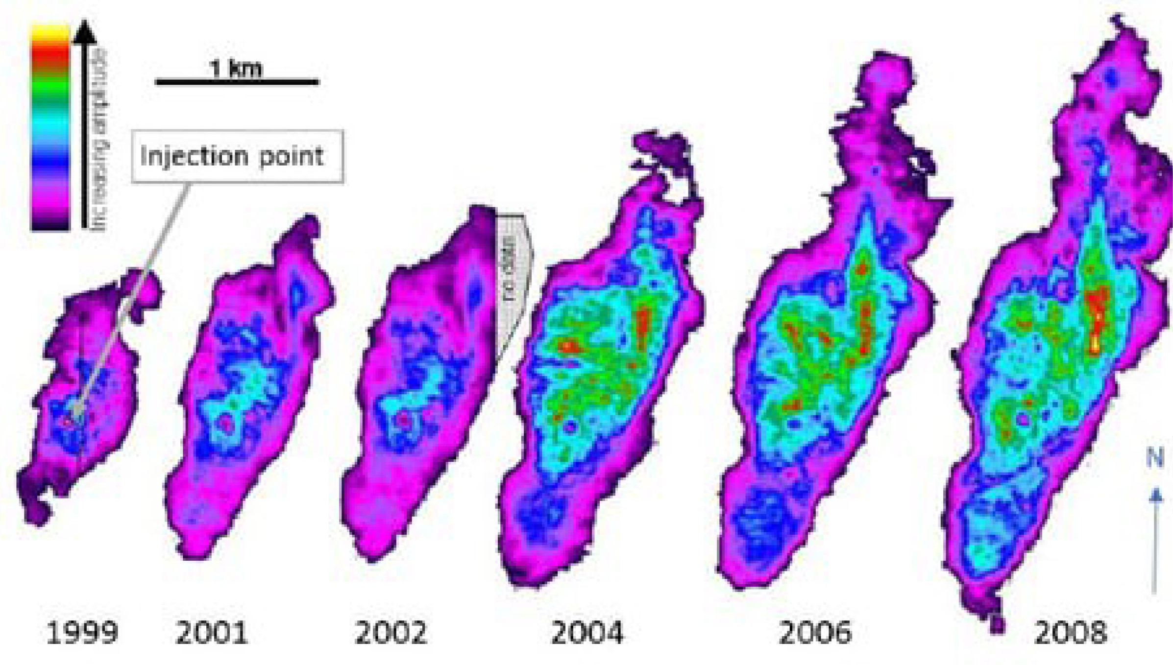 In 1999 the SACS (Phase 1) project (supported under the European Commission’s Thermie Programme) started monitoring the CO2 behaviour and established a baseline by shooting a first 3D seismic survey (Gale et al, 2001), . The Phase 1 Project was extended to SACS2 in 2000 again with European Commission (EC) support. The SACS2 project, which terminated in 2003, continued the work undertaken in Phase 1 with further repeat 3D seismic surveys 74 completed to track the fate of the injected CO2. In addition, it is using the seismic data to verify available models and tools originally developed for hydrocarbons and water that have been applied to a CO2 and water system. The major difference being that CO2 is soluble in water and methane is not.