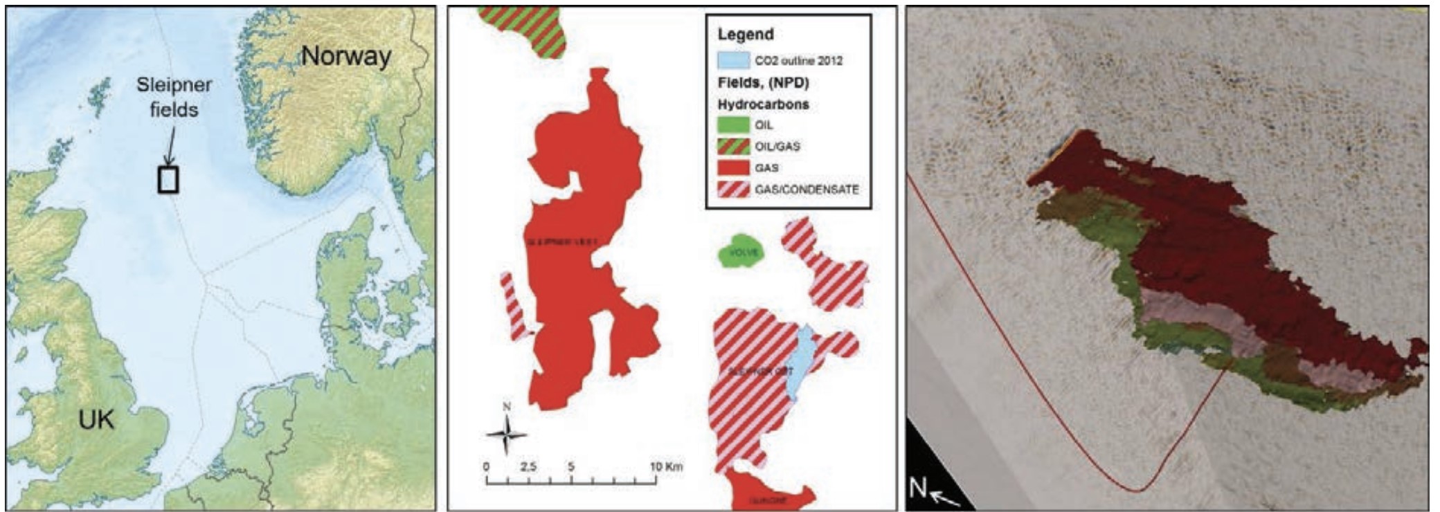 Figure 1: Left: location map (courtesy of Uwe Dedering). Middle: the Sleipner fields with the outline of the CO2 plume in 2013 indicated (base map courtesy of NPD). Right: A seismic difference section illustrating the extent of the CO2 plume in 2013.