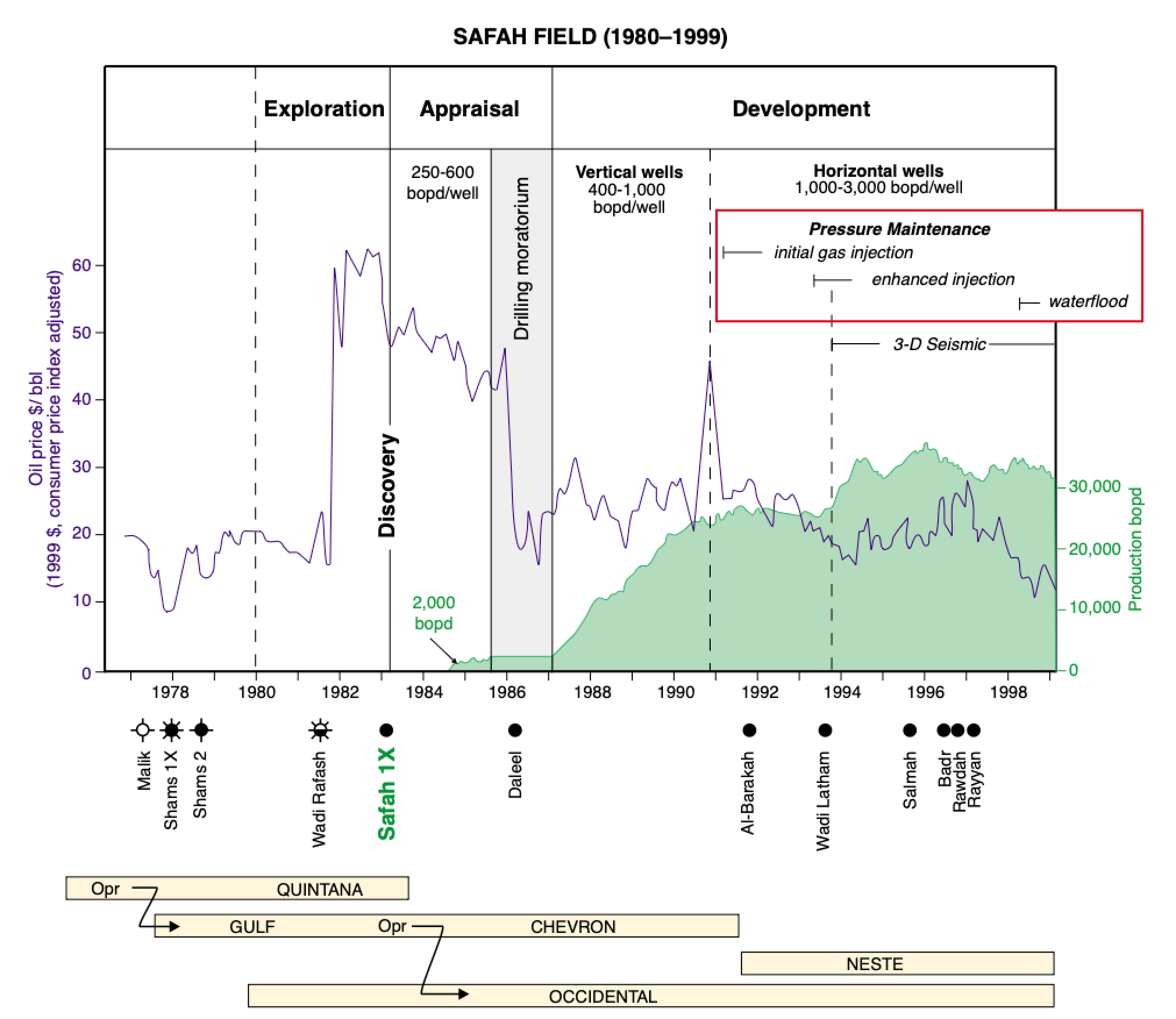 | 1983 | Открытие месторождения скважиной Safah-1x | Boote & Mou, 2003 |