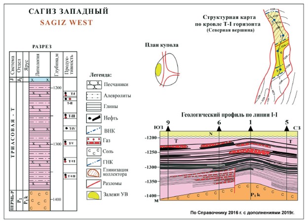 Газонефтяное месторождение Сагиз Западный находится в центральной зоне Южно-Эмбинской НГО. В структурном отношении месторождение приурочено к трехкрылому соляному куполу Сагиз, на западном крыле которого разведаны новые залежи. Фактически Сагиз Западный можно считать отдельным участком основного месторождения. На этом участке, расположенном в районе второго крутого уступа соляного ядра, в триасовых отложениях выявлено 7 нефтяных горизонтов, на 5 из которых присутствуют газовые шапки.