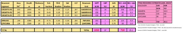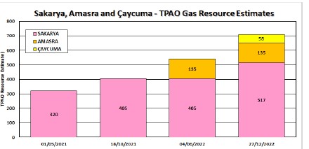 The current total TPAO gas resource estimate for the three discoveries is 710 BCM (25.1 TCF)–the chart below illustrates the evolution in TPAO resource estimates.