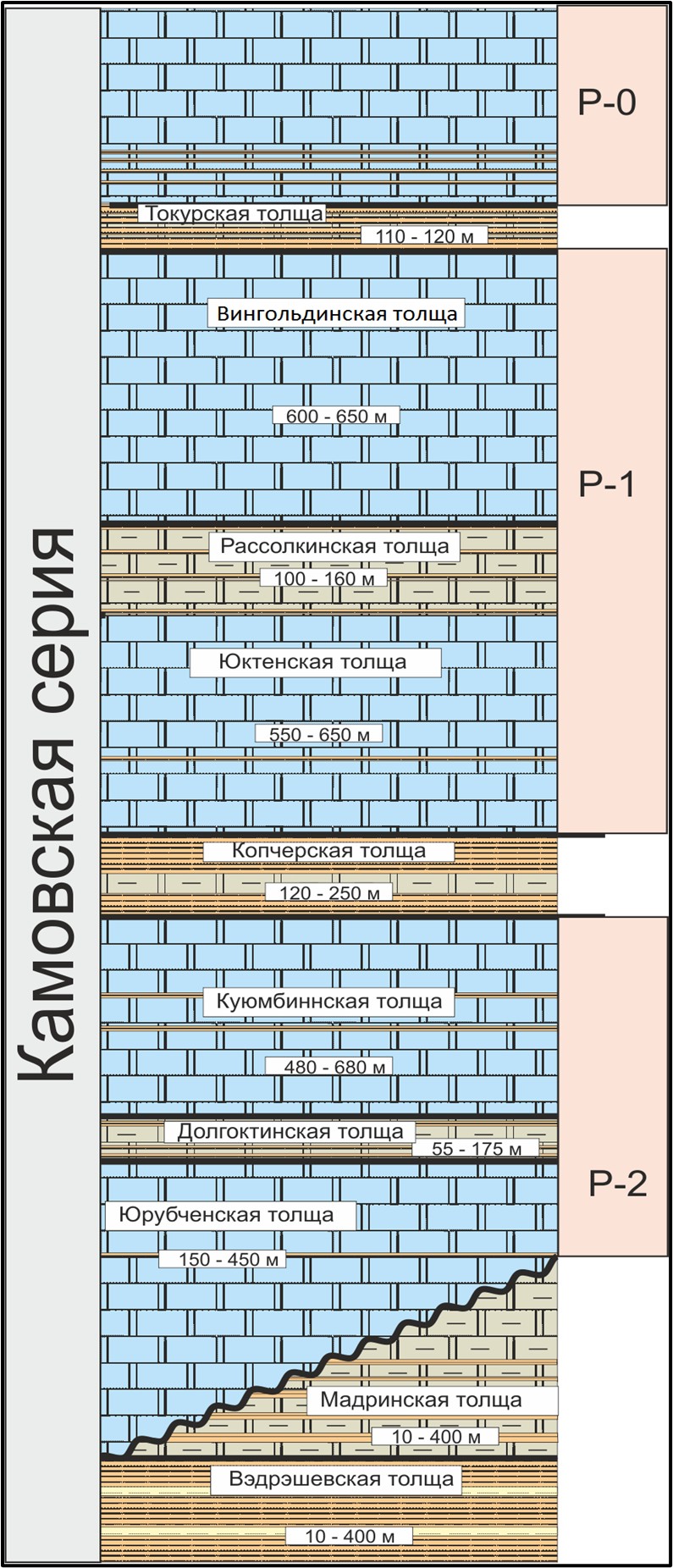 Традиционно в разрезе рифея Камовского НГР выделяется три продуктивных горизонта– Р-0, охватывающий отложения ирэмэкэнской толщи, Р-1, включающий отложения от юктенской до вингольдинской толщи и горизонт Р-2, включающий породы юрубченской, долгоктинской и куюмбинской толщ. Покрышкой горизонта Р-1 служат аргиллиты токурской, а Р-2 – копчерской толщи (Рис.2).