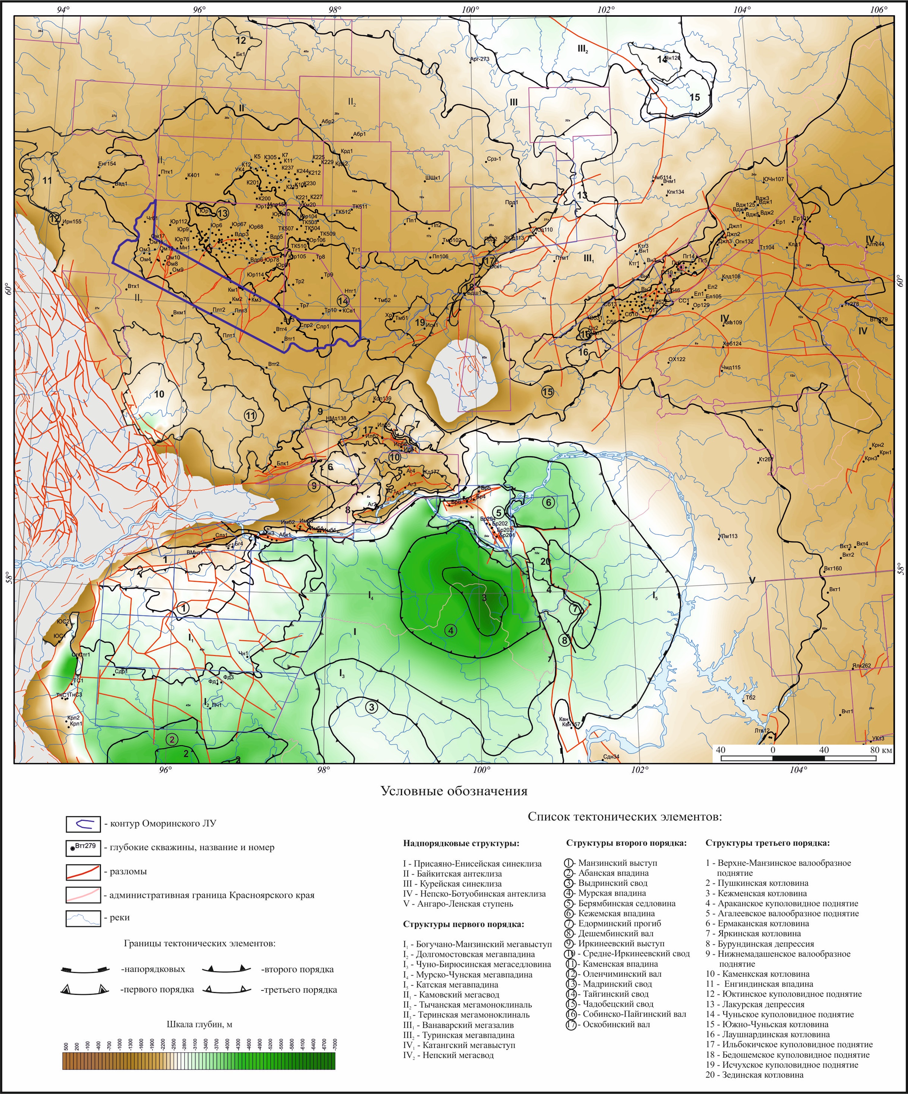 В пределах Оморинского лицензионного участка по данным сейсморазведки выявлена система дизъюнктивных нарушений разной направленности. На Салаирской площади дизъюнктивов в венд-кембрийском ярусе не выделено. Исключение составляют мелкие нарушения (большей частью в верхней части разреза), связанные с проявлением траппового магматизма, который в пределах рассматриваемой территории пространственно локализован на двух уровнях. Первый охватывает верхнюю часть разреза в пределах ангарской и бельской свит; второй - отложения усольской свиты.