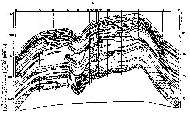 Рис. 1. Самотлорское нефтегазовое месторождение. Геологические профили продуктивных горизонтов: 1,2,3 — песчаник соответственно газо-, нефте- и водонасыщенный; 4 — глины