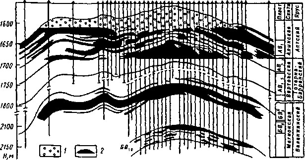 Рис. 2. Самотлорское нефтегазовое месторождение. Геологический разрез продуктивных отложений (по Ф.К. Салманову): 1 — газ; 2 — нефть