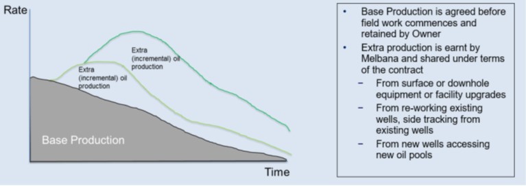 Under an IOR contract, additional production above an agreed base production rate is shared as depicted figuratively below in Figure 3. In general, the commercial terms are consistent with exploration PSC terms, such as those that apply to Melbana’s Block 9 PSC, with provisions for cost recovery and sharing of profit oil.