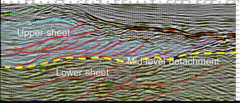 Melbana has developed a multi layered duplex structural model for Block 9 which described undiscovered potential within the deeper sheet below a seal at the mid level detachment. This Block 9 structural model has now been applied at Santa Cruz field where there is a good quality PSDM 3D seismic dataset with 18 deviated development wells for control. All the main elements that characterize the Block 9 structural model are observed to also be present at Santa Cruz: ‒ upper and lower duplex sheets with internal thrusting ‒ A mid level detachment separates the sheets and can be seen clearly.