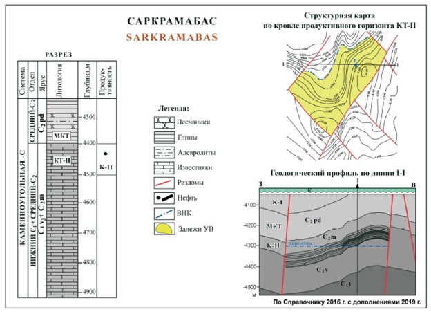 Нефтяное месторождение Саркрамабас расположено на востоке Восточно-Прикаспийской НГО, в северной части Жанажолского карбонатного шельфа. Здесь к северу от месторождения Жанажол обособляются несколько тектонических блоков. На блоке Саркрамабас установлена продуктивность известняков регионально нефтегазоносной толщи КТ-II.