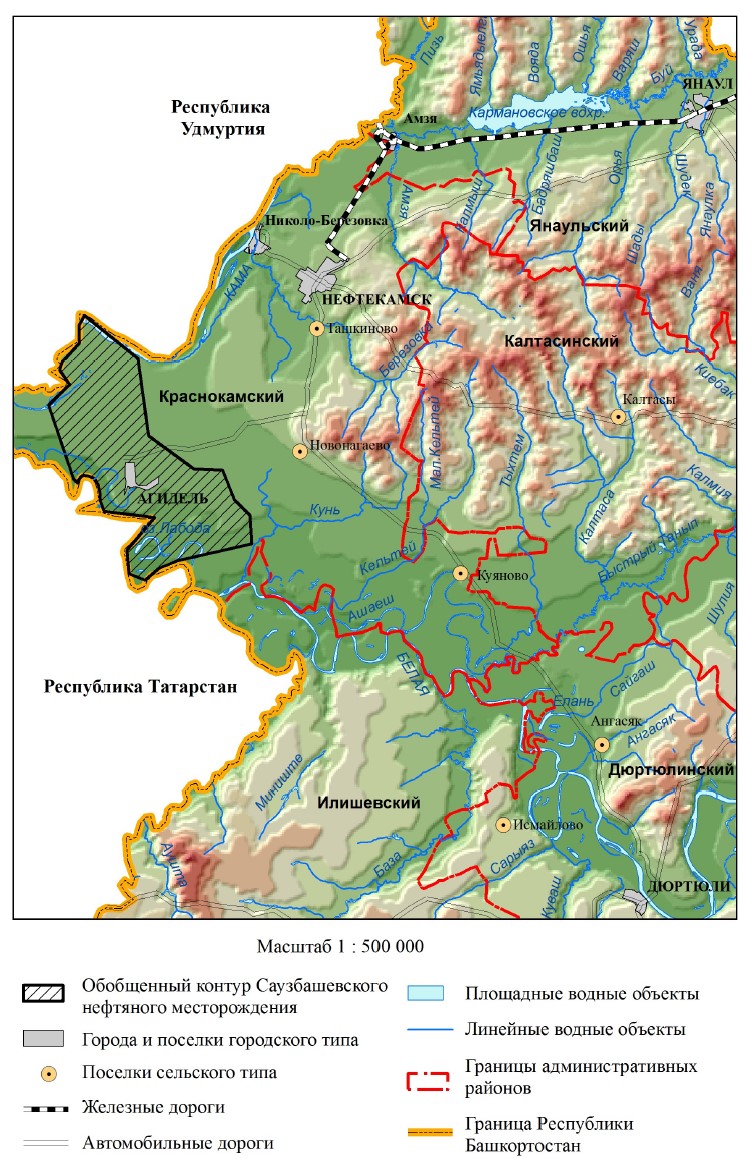 Саузбашевское нефтяное месторождение открыто в 1959 году и является типичным месторождением Арланского типа. В административном отношении Саузбашевское месторождение расположено в Краснокамском районе Республики Башкортостан (Рис.1.). Расстояние от его северо-восточной границы до районного центра п. Николо-Березовка 18 км, до города Нефтекамска — 21 км. Наиболее значимыми населенными пунктами на площади месторождения являются город Агидель, поселки Саузбаш, Новокабаново, Староянзигитово. С другими административно-промышленными центрами Башкортостана г.г. Уфой и Бирском Саузбашевское месторождение связано водными путями по рекам Белой и Каме и шоссейными дорогами. Ближайшая пристань на реке Каме – п. Николо-Березовка, на реке Белой – п. Азякуль. В период навигации с мая по октябрь месяцы эти пристани используются в качестве грузоперевалочных баз.