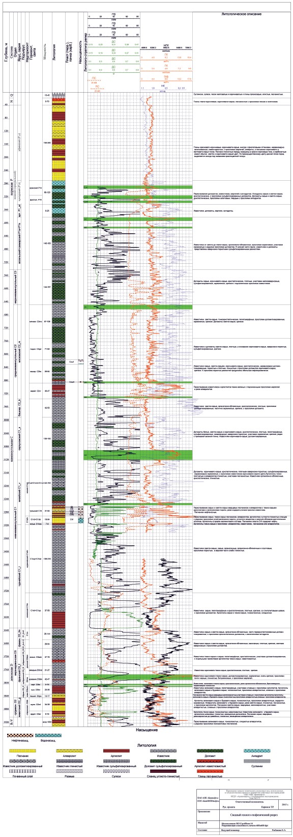 Приводятся краткие обобщенные сведения о литологической характеристике стратифицированных подразделений согласно сводному геолого-геофизическому разрезу Саузбашевского месторождения (Граф.2). За основу стратиграфического расчленения взята общая стратиграфическая шкала фанерозоя 2006 г и обобщенная схема расчленения геологического разреза Башкортостана, принятая для работы в ОАО АНК «Башнефть» в 1998 г. в качестве стандарта с уточнениями 2002 г.