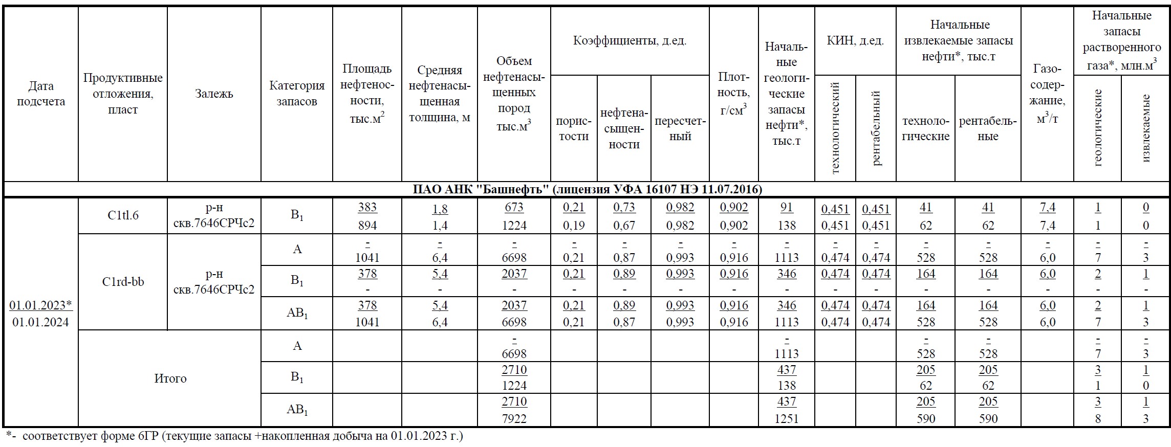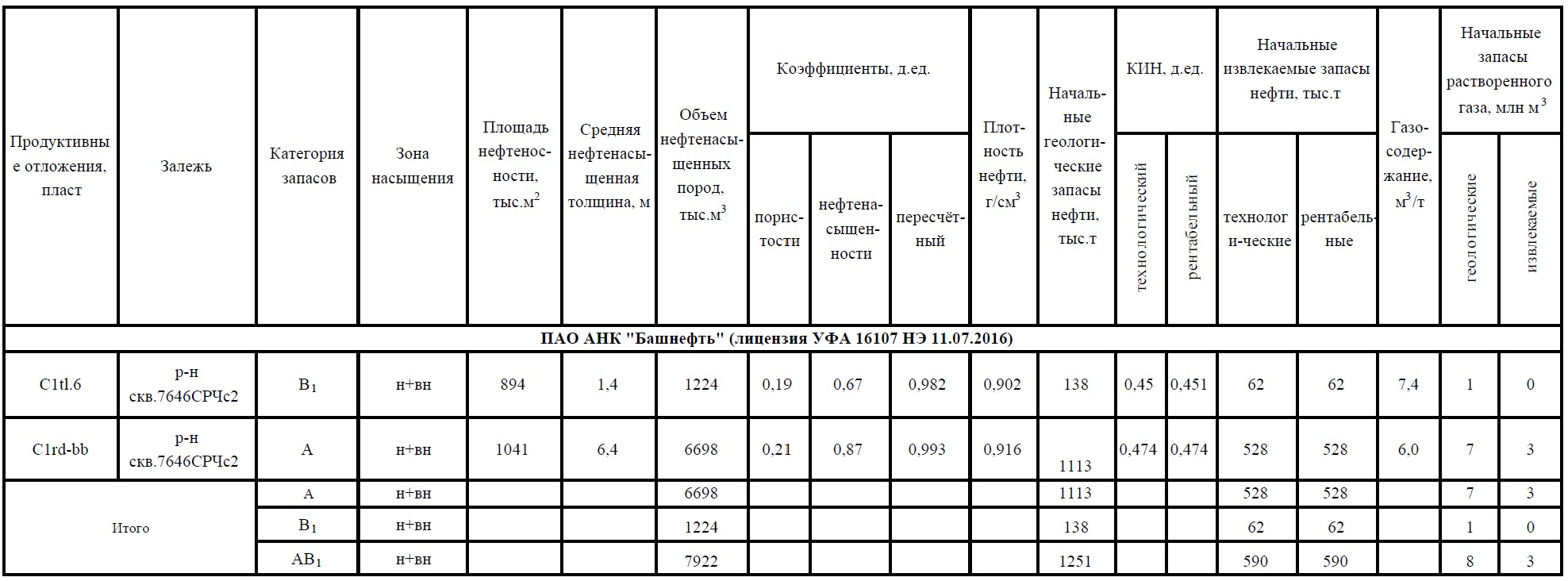 Таблица 2. Сопоставления подсчетных параметров, запасов нефти и растворенного газа по залежам района скв. 7646СРЧс2 пластов С1tl.6, C1rd-bb Саузбашевского месторождения