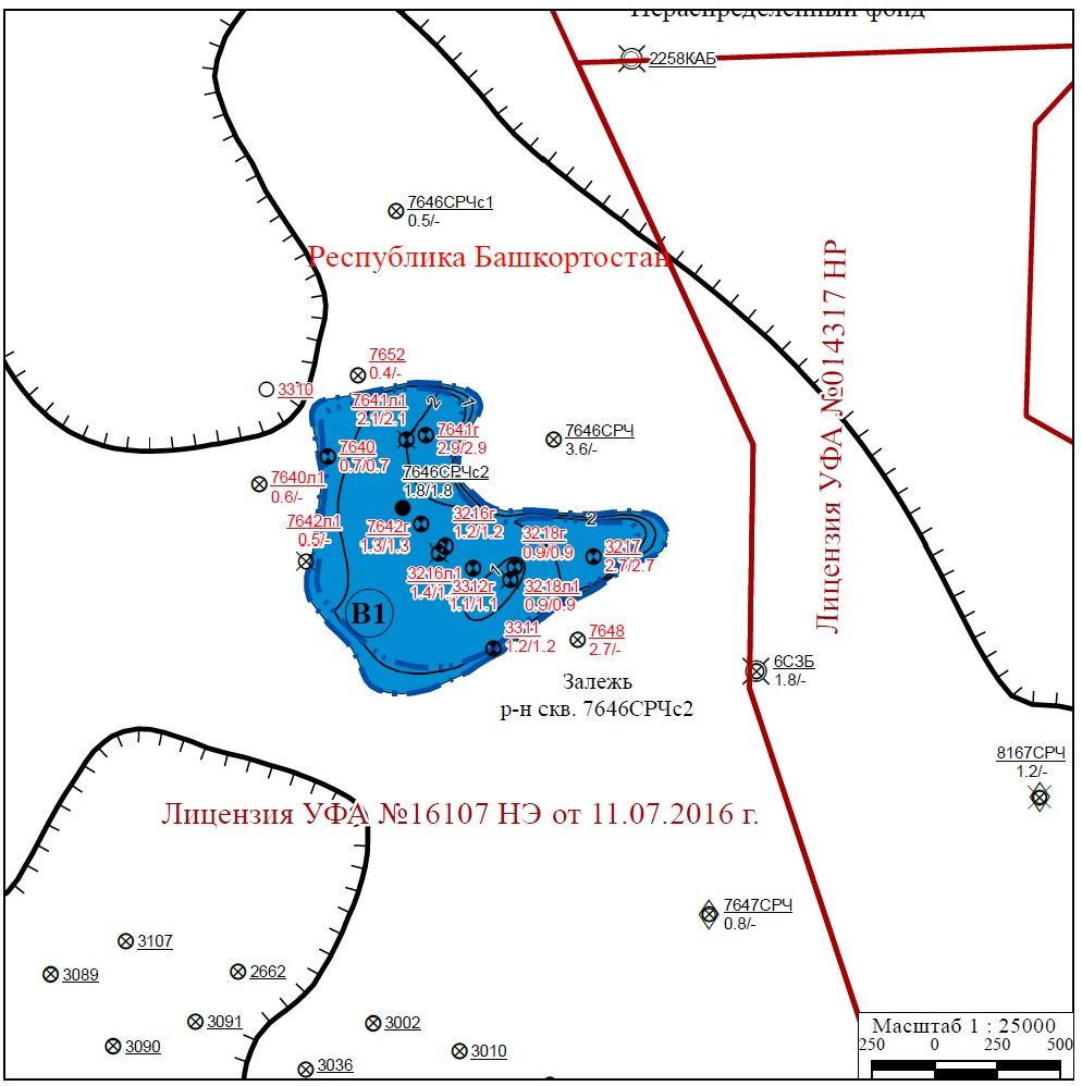 Все скважины, пробуренные в зоне запасов категории В1, вскрыли коллектор пласта С1tl.6 эффективной нефтенасыщенной толщиной от 0,9 до 2,9 м. В трех скважинах (№№7640, 3217, 3311) по данным интерпретации ГИС выделен нефтенасыщенный коллектор пласта С1tl.6 с эффективной нефтенасыщенной толщиной от 0,7 до 2,7 м. В четырех остальных по данным интерпретации ГИС выделен водонасыщенный коллектор. Скважина №3310 вскрыла зону отсутствия коллектора.