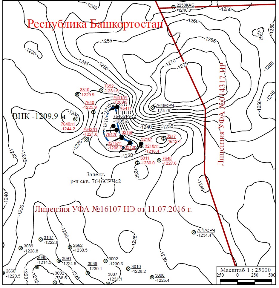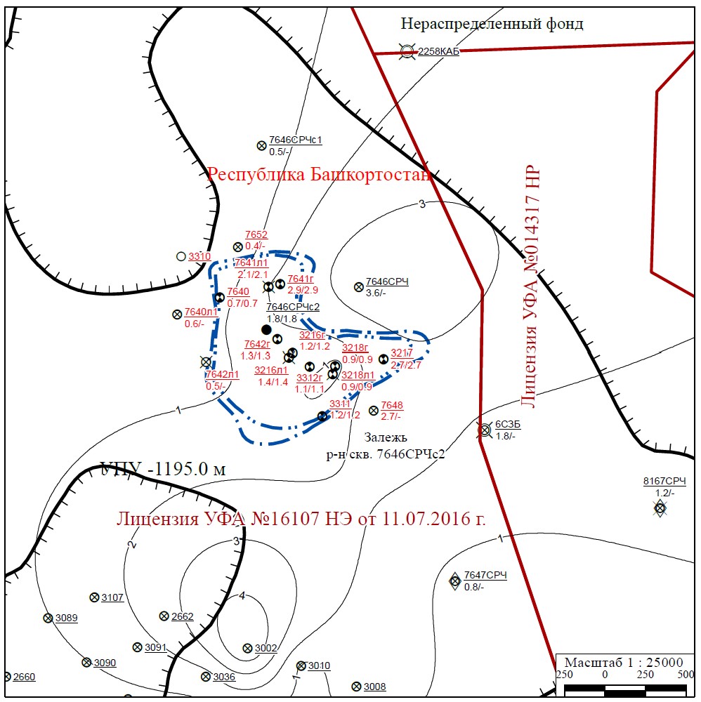 Скважины №№3217, 3311, 7640г, пробуренные за пределами ранее утвержденного контура, вскрыли, по данным интерпретации ГИС, коллектор пласта эффективной нефтенасыщенной толщиной от 1,2 до 4,6 м, остальные скважины вскрыли, по данным интерпретации ГИС, водонасыщенный коллектор.