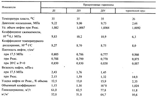 Пористость коллекторов в среднем составляет 16,2%. Проницаемость - 0,238 мкм2 по керну и 0,502 мкм2 по промысловым исследованиям. Нефтенасыщенность 77-93% (по залежам). В песчаниках ДIV установлено 10 залежей структурного типа. Размеры их небольшие. ВНК в пределах от -1567 до -1576 м. Начальные дебиты скважин до 190 т/сутки.