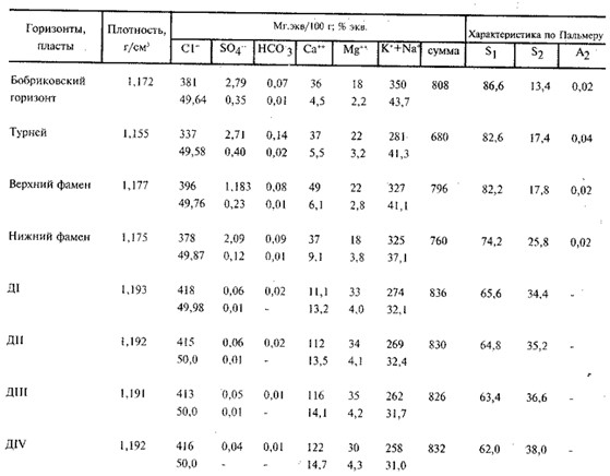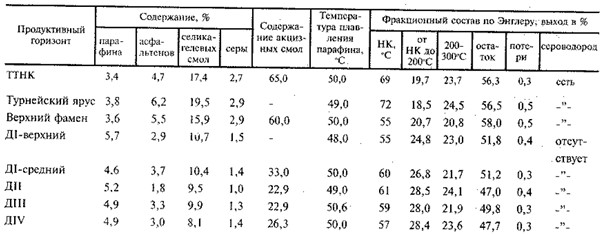 Состав и свойства пластовых нефтей приведены в табл. 1. В пределах одного продуктивного горизонта свойства нефтей изменяются несущественно. Нефти основных горизонтов ДІ и ДII различаются между собой незначительно. Нефти нижнего карбона более тяжелые и вязкие. Имеют меньшую газонасыщенность и низкое давление насыщения. Нефти турнейского яруса и бобриковского горизонта практически идентичны. По компонентному составу нефти девонских объектов метанового типа. Нефти парафинистые и сернистые.